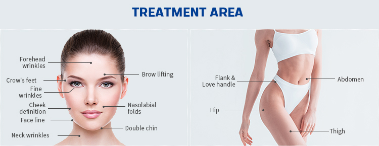 Use the body cartridges with different depths ( 8mm, 13mm, ), and transforms them into 65-70 degree heat energy to break and dissolve fat cells by focusing ultrasonic. The intelligent positioning system locates the required fat cells and quickly crushes and dissolves large granular fat cells to reduce the amount of fat, while stimulating collagen contraction and proliferation, and quickly filling the gaps that appear after the fat is ablated. After treatment, the skin surface is thin and not wrinand it will not cause damage to the epidermis, blood vessels, nerves, and muscle tissues. The crushed fat will be excreted from the body as the body metabolizes.