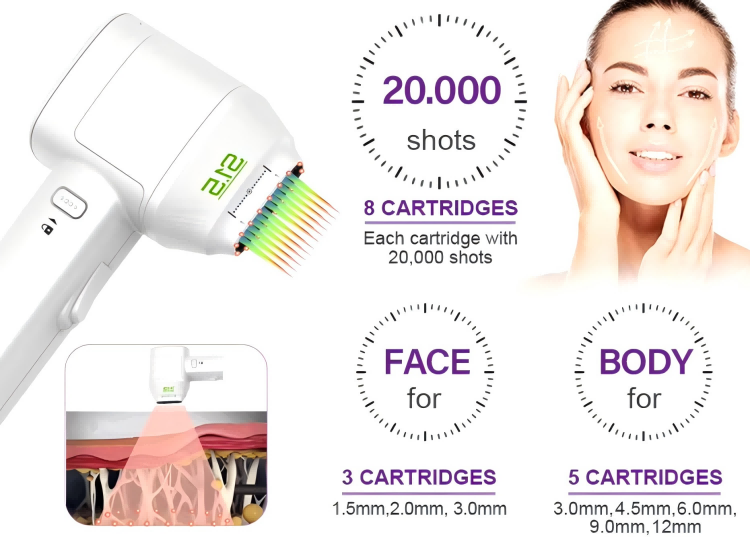 3. Different cartridges treatment 8 skin depths act on a variety of parts, such as the face, neck, chest, arm, body and vaginal, etc.