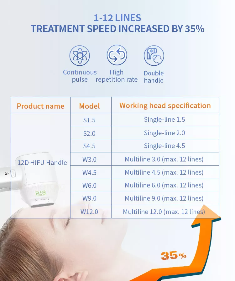 DS-1.5mm is for the epidermis layer;DS-3.0mm is for the dermis layer;DS-4.5mm is for the SMAS layer.DS-6.0mm/9mm/12mm for body fat layer