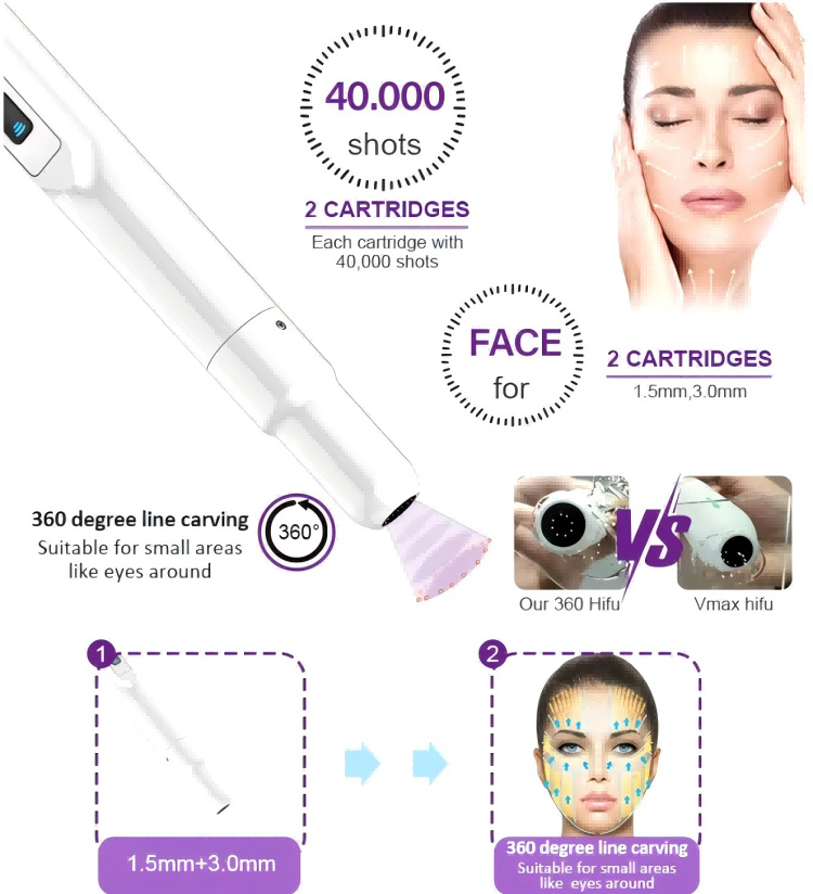 360° hifu face cartridge focuses energy shortly and intensively on the target area while rubbing the probe, it makes less pain than other HIFU brands, operation time can be shorter than normal HIFU operation. This shorter operation time enables to do more operations and it helps to get good results rapidly. it can be done around the eyes, mouth, nose. and can treat blackheads